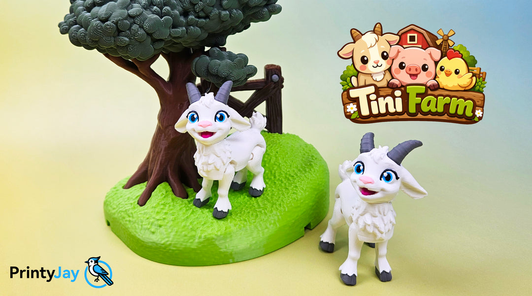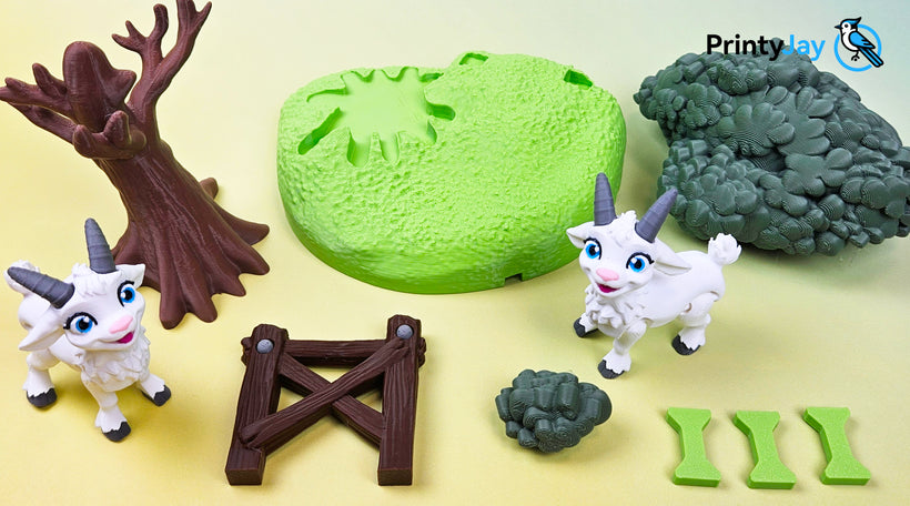 This little goat comes with her own piece of meadow, a small tree, and a fragment of a fence - a tiny cozy scene straight from a miniature farm!